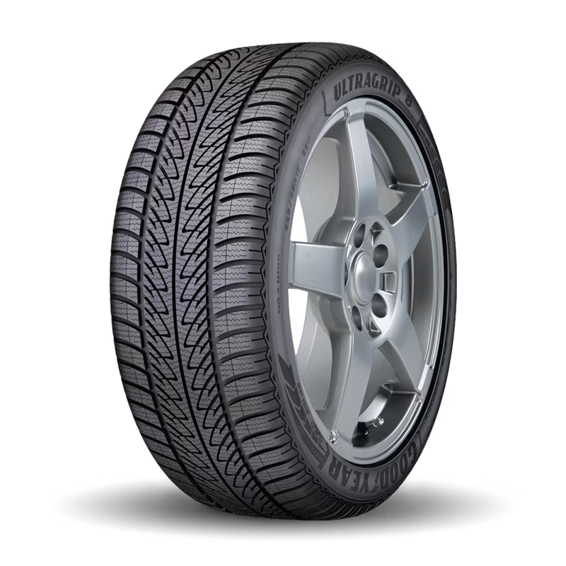 The Goodyear Ultra Grip 8 Performance tire excels in winter conditions with advanced features for safety and control. Its numerous sipes with biting edges deliver superior braking on hard-packed snow and ice, while the saw-shaped center rib enhances traction on snow-covered roads. The optimized polymer blend and silica tread compound maintain flexibility in low temperatures, ensuring consistent grip. A directional tread pattern efficiently channels water for confident handling on wet and slushy surfaces. Certified with the Three-Peak Mountain Snowflake symbol, this tire meets rigorous snow performance standards for severe winter conditions.